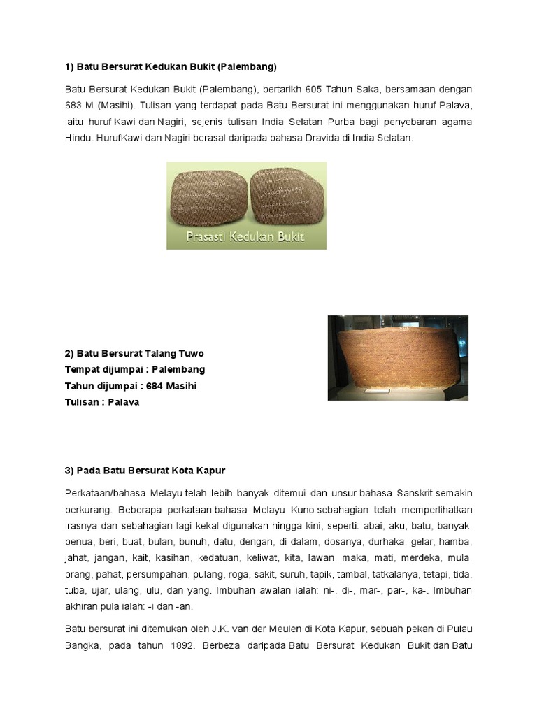 bahasa melayu from image.slidesharecdn.com Lokasi penemuan batu bersurat di alam melayu *kedukan bukit *kota kapur apakah maklumat yang diperolehi daripada penemuan tersebut. They have changed to batu bersurat but its ok. Prasasti kota kapur adalah prasasti berupa tiang batu bersurat yang ditemukan di pesisir barat pulau bangka, di sebuah dusun kecil yang bernama kotakapur. Frequently asked questions about kuala berang batu bersurat roundabout. Beli batu kapur langsung dengan harga terbaru 2021 terbaik dari supplier , pabrik, importir, eksportir dan distributor. (a) batu bersurat kedukan bukit (palembang), bertarikh 605 tahun saka, bersamaan dengan 683 m (masihi). Pallava inscribed column (dated 686 ad.), concerning sriwijaya, found on the island bangka, indonesia (stitch; Huruf yang digunakan dalam penulisannya adalah aksara pallawa dengan menggunakan bahasa melayu kuno.