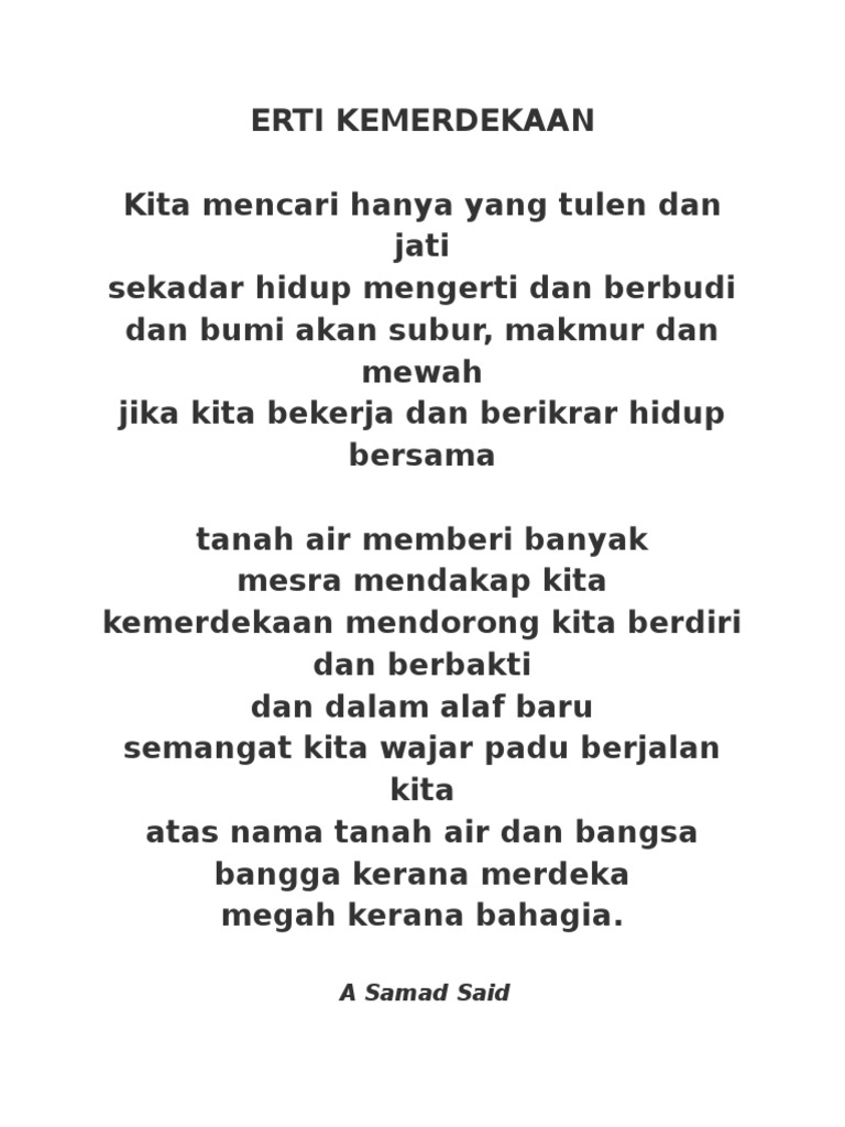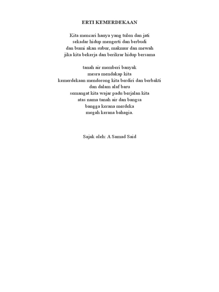 Satu deklamasi sajak berjudul erti kemerdekaan. Samad said and explore their bibliography from amazon.com's a. Riwayat hidup rasulullah saw dalam puisi. Semoga sajak kemerdekaan yang pernah dihasilkan oleh tokoh sasterawan negara dan tokoh sastera kita ini dapat menjadi inspirasi buat kita semua rakyat *datuk a samad said atau nama sebenarnya abdul samad bin muhammad said merupakan seorang yang tidak asing lagi bagi rakyat malaysia. Sokong dgn beli buku atau taja penerbitan.