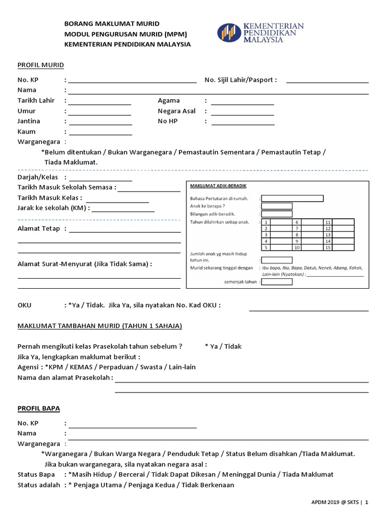 Rasanya sama saja semua sekolah sebab menggunakan borang dari kementerian pendidikan malaysia. Sila upload borang di bawah. Borang maklumat murid modul pengurusan murid, sistem pengurusan sekolah kementerian pendidikan malaysia. Setiap kali persekolahan bermula, murid mesti menyerahkan borang bmm. Letih nak menulis maklumat anak setiap tahun.